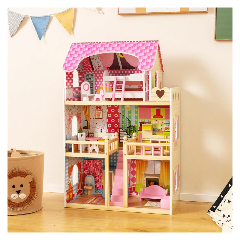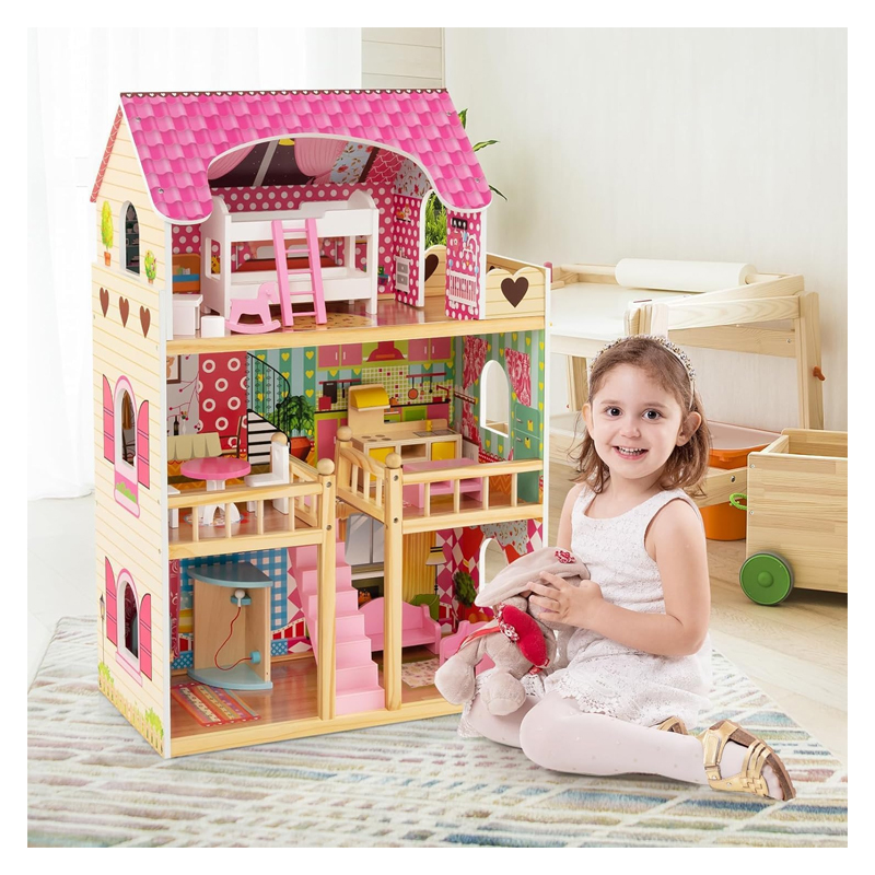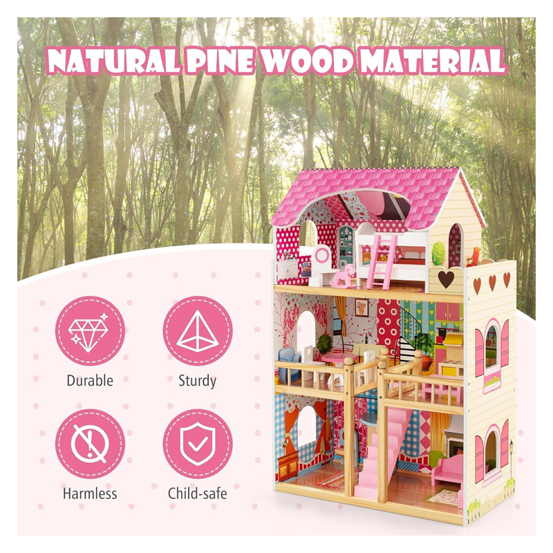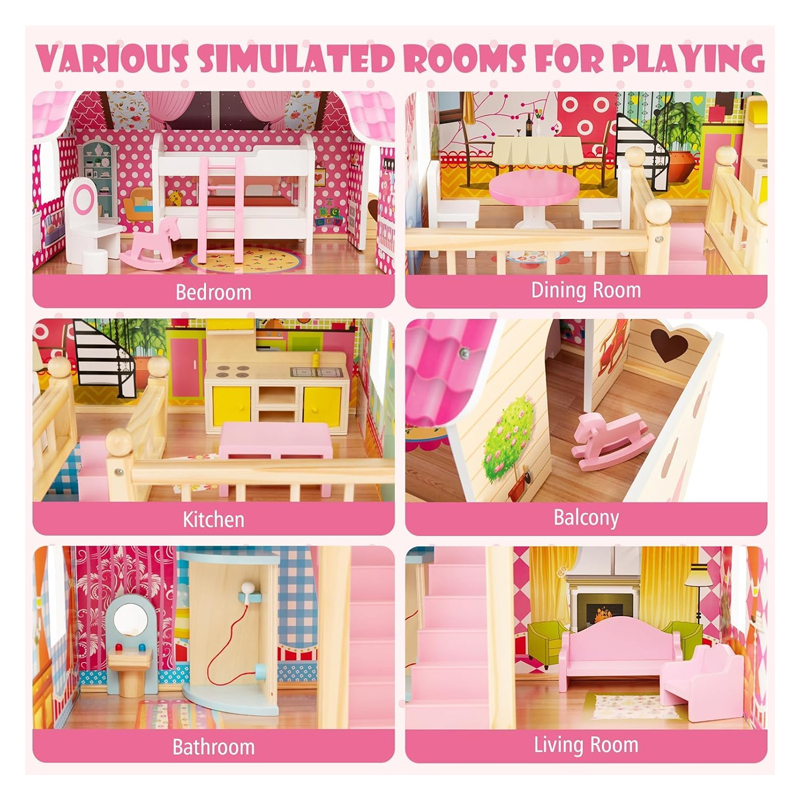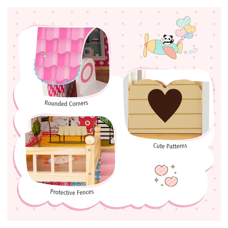 - ⭐️ 👱🏻♀️[𝗗𝗘𝗟𝗜𝗚𝗛𝗧𝗙𝗨𝗟 𝗗𝗘𝗧𝗔𝗜𝗟𝗦]: Beautiful colors and details make the dollhouse aesthetically pleasing for a realistic and thrilling experience to build your child’s imagination and creativity. Made of natural pine wood material and durable MDF, the doll house is sturdy and built to last. Rounded corners and burr-free edges protect kids’ delicate skin from scratching. Meanwhile, approved by ASTM and CPSIA, it is also harmless and child-safe.